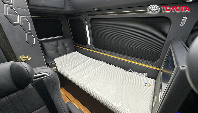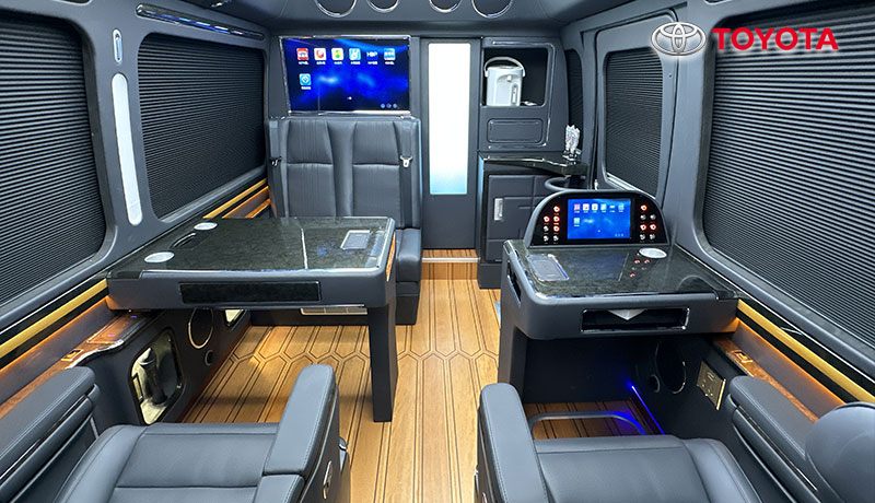 黑色蒙娜丽莎款外观、埃尔法座椅、智能床榻、车载卫生间、汇报席、卓越款隔断门、豪华影音卡拉Ok、总裁办公桌、助理控制台、进口地板、空客顶灯、电动床、恒温风道、电动窗帘等
