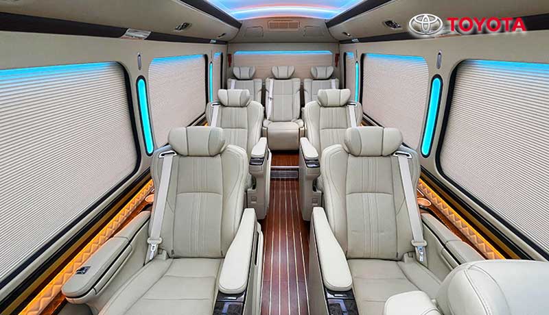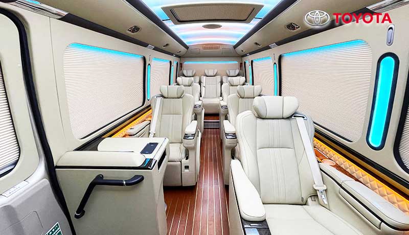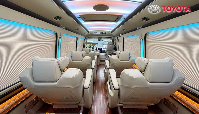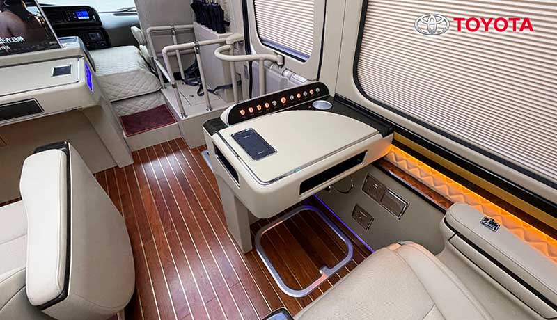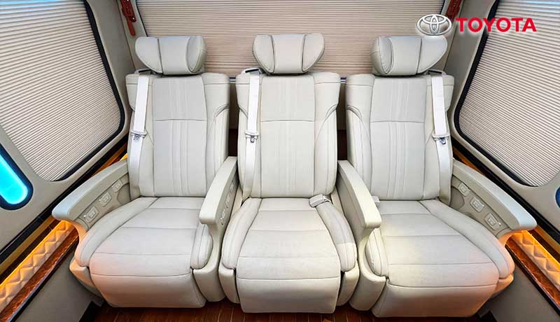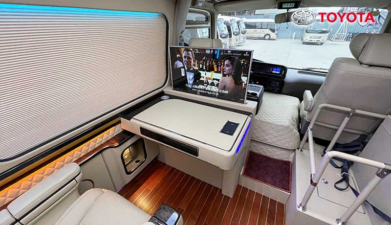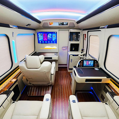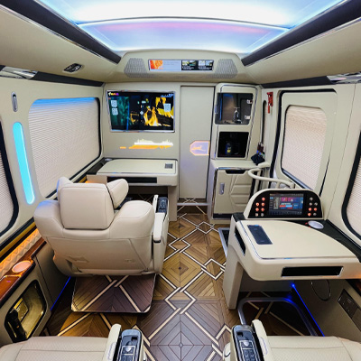 蒙娜丽莎款外观、埃尔法座椅、电动升降电视、豪华影音卡拉Ok、总裁办公桌、助理控制台、进口地板、空客顶灯、电动床、恒温风道、电动窗帘等