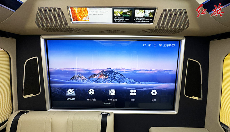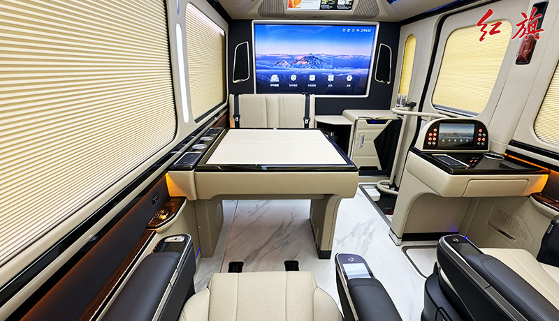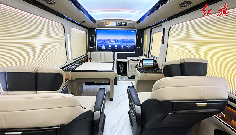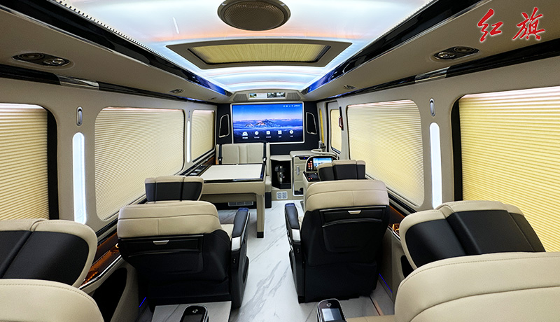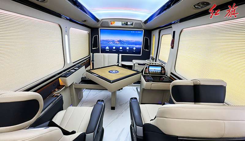 55寸升降电视全隔断,麻将桌,双人汇报席,迎宾智显屏,4张太空座椅,A380空客顶灯,分体电动床,防滑耐磨地板,电动侧窗,秘书桌,电动窗帘,恒温风道、净化器统等。