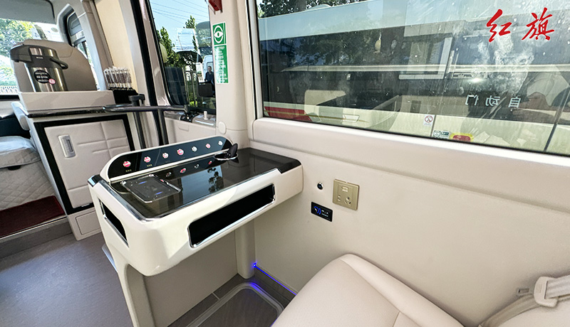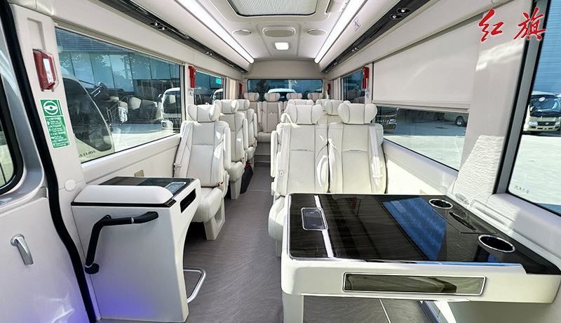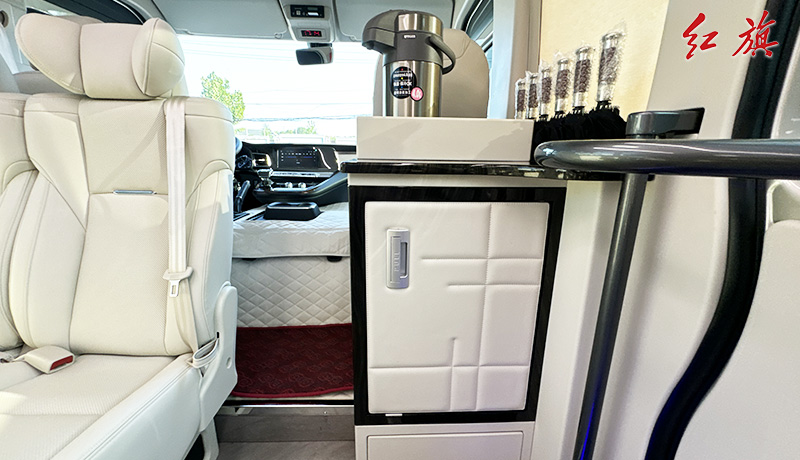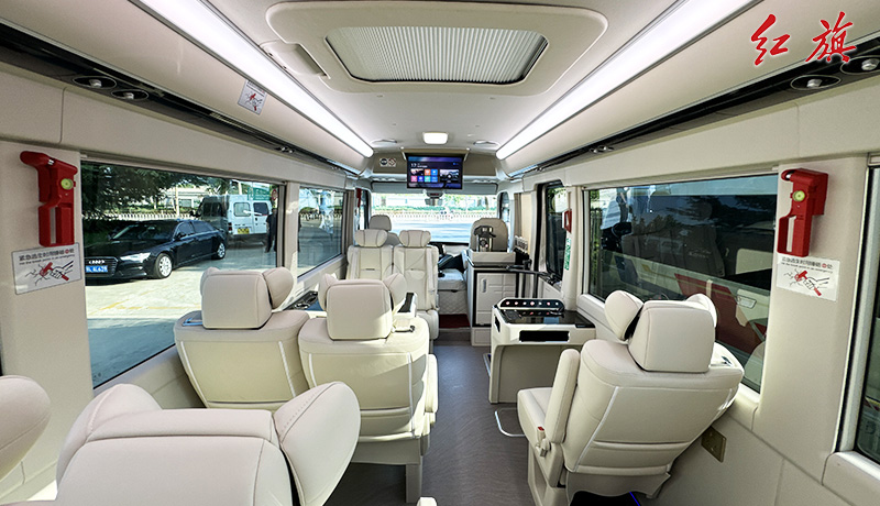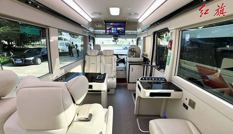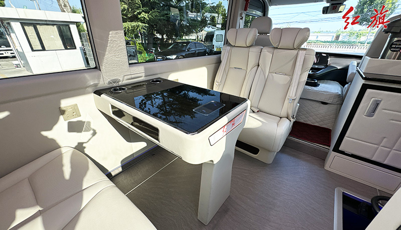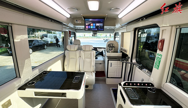 LOGO标识,对坐布局,加宽加厚真皮软包座椅,LED长条顶灯,防滑耐磨地板,办公桌,秘书桌,上下推拉窗帘,车载冰箱、电加热水壶、24寸联网电视、暖风系统,高级雨伞槽等